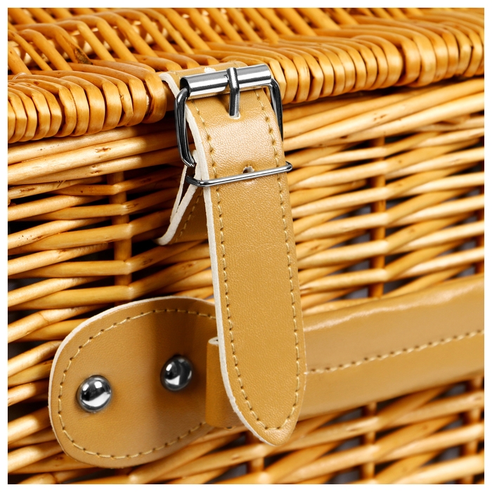 Корзина для пикника с посудой — компактный и функциональный набор для отдыха на природе. Изделие плотно фиксируется специальными ремешками. Корзина выполнена из натуральной лозы и имеет древесную текстуру.
