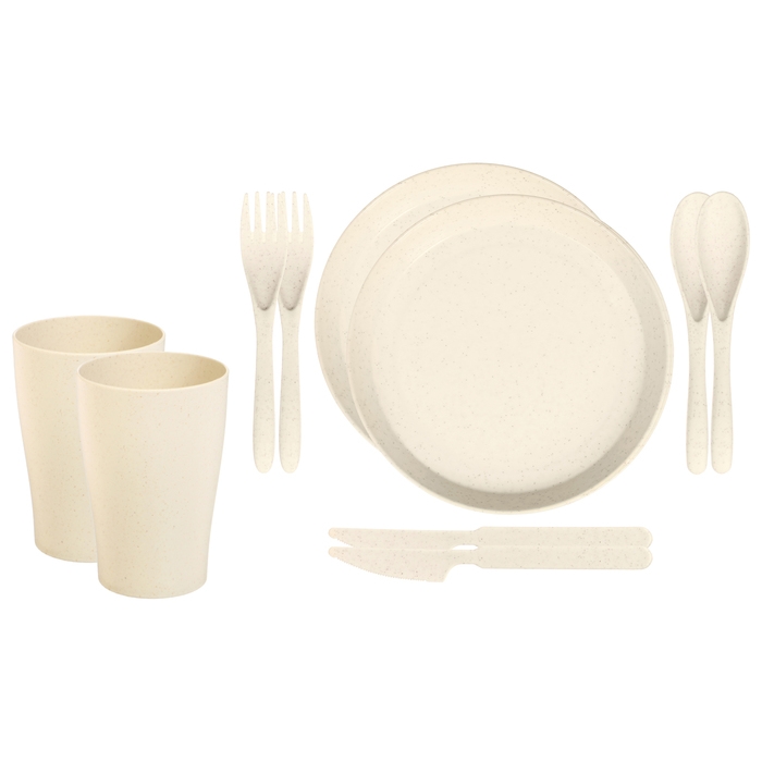 - Универсальный набор многоразовой посуды: ножи, вилки, ложки, тарелки, стаканы и салфетка.