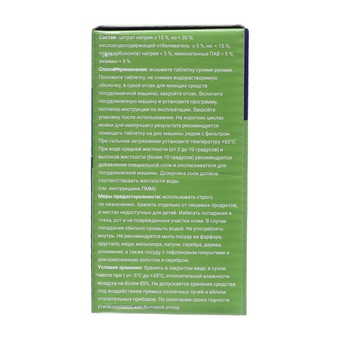 Состав:цитрат натрия ≥ 15 %, но < 30 %;кислородосодержащий отбеливатель ≥ 5 %, но < 15 % поликарбоксилат натрия < 5 %; неионогенные ПАВ < 5 %;энзимы < 5 %.