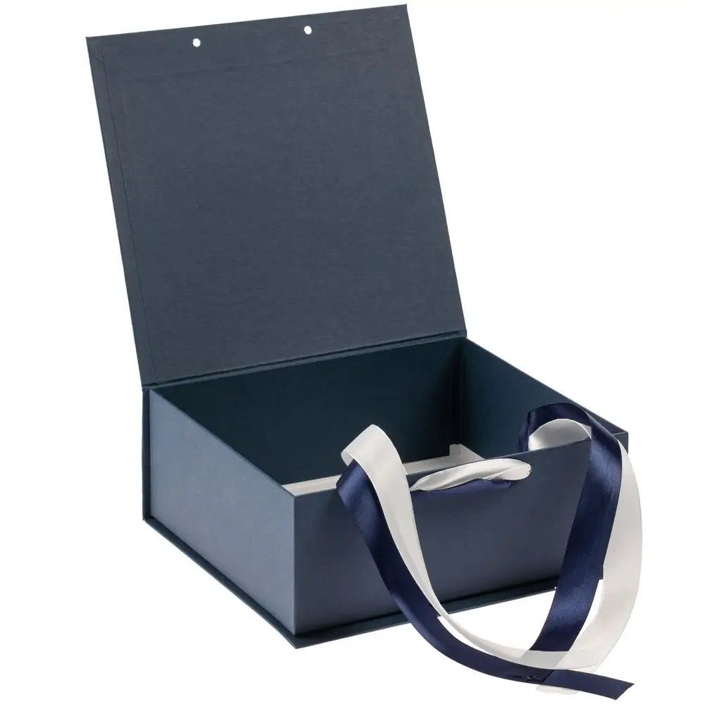 Коробка выполнена из переплетного картона, кашированного дизайнерской бумагой Malmero «Благородный синий», с крышкой на лентах.