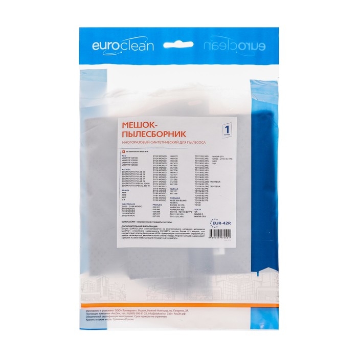 Мешок-пылесборник EUR-42R Euroclean — это многоразовое изделие, предназначенное для использования в пылесосах. Он изготовлен из прочного и долговечного материала, который обеспечивает эффективную фильтрацию воздуха от пыли и грязи.
