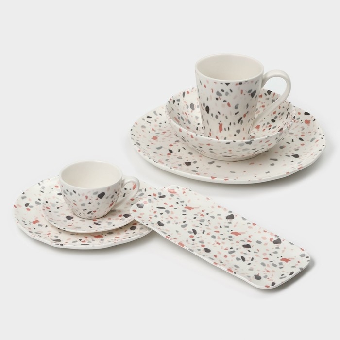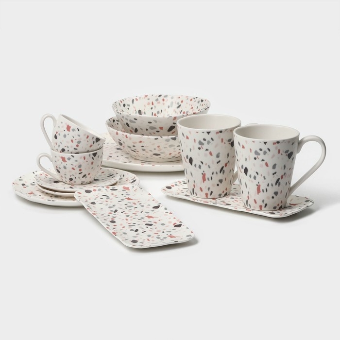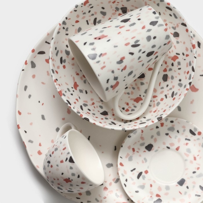 Изделия устойчивы к механическим повреждениям, имеют цветное покрытие, которое долго сохраняет яркость. Вся посуда подходит для использования в посудомоечной машине. Выполнены из высококачественного фарфора в серии посуды Terazzo.
