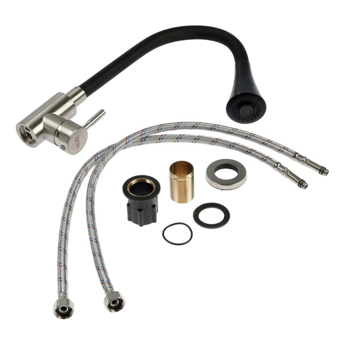 Смеситель для кухни ZEIN изготовлен из нержавеющей стали и предназначен для установки на горизонтальной поверхности — кухонной мойке или столешнице.
