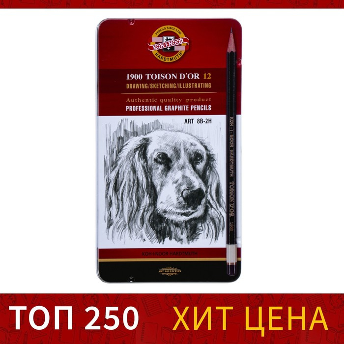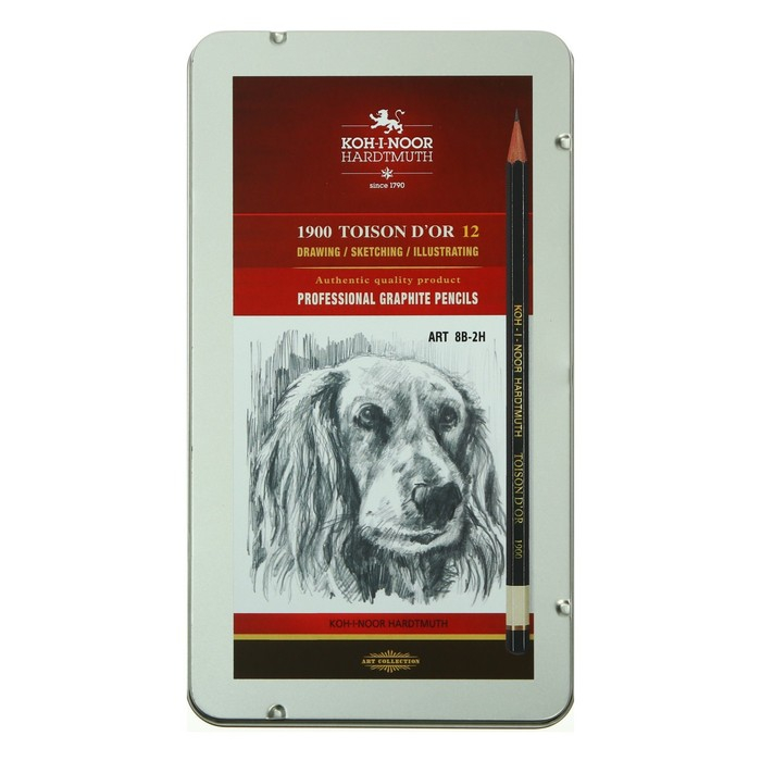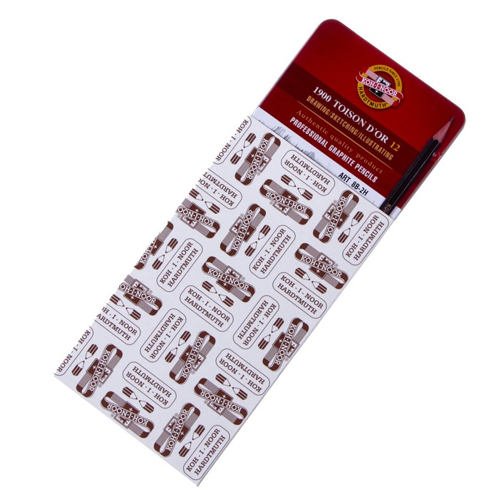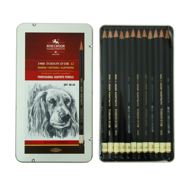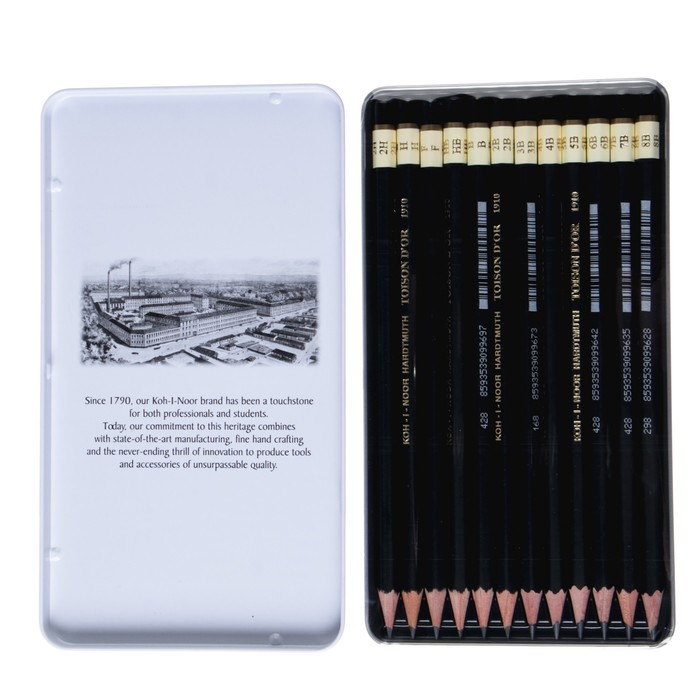 Набор карандашей чернографитных разной твердости 12 штук Koh-i-Noor 1912, 8B-2H, утолщённые, в металлическом пенале