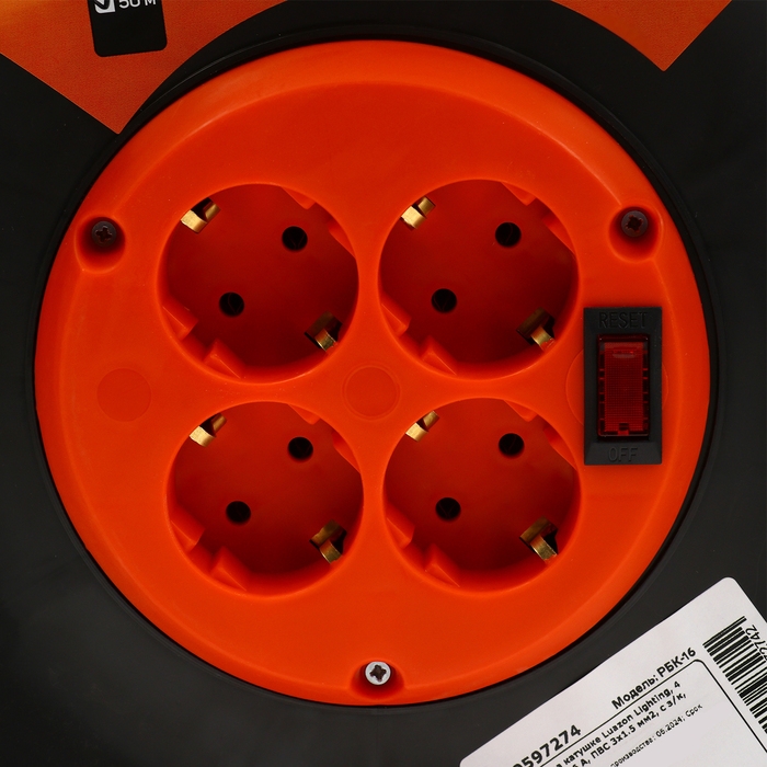 Удлинитель на катушке Luazon Lighting ЕСО, 4 розетки, 50 м, 16 А, ПВС 3х1.5 мм2, с з/к, IP 20, термовыключатель