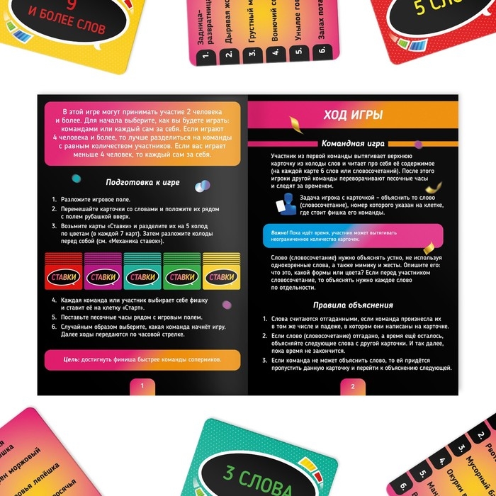А чтобы сделать игру ещё интереснее и добавить нотку азарта, используйте карты ставок. Перед ходом другой команды (или игрока) пытайтесь предсказать, сколько слов или словосочетаний сможет объяснить команда или игрок. Если ставка сыграла, получайте дополнительные баллы.