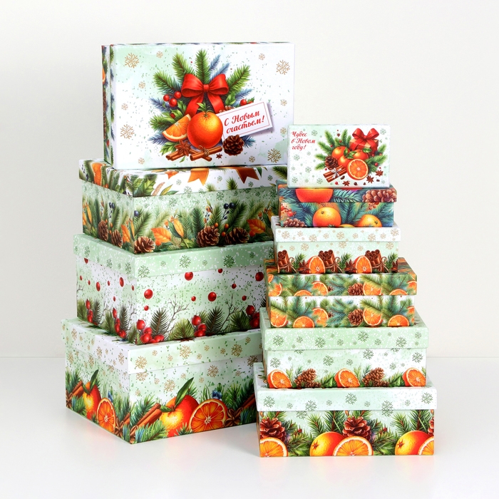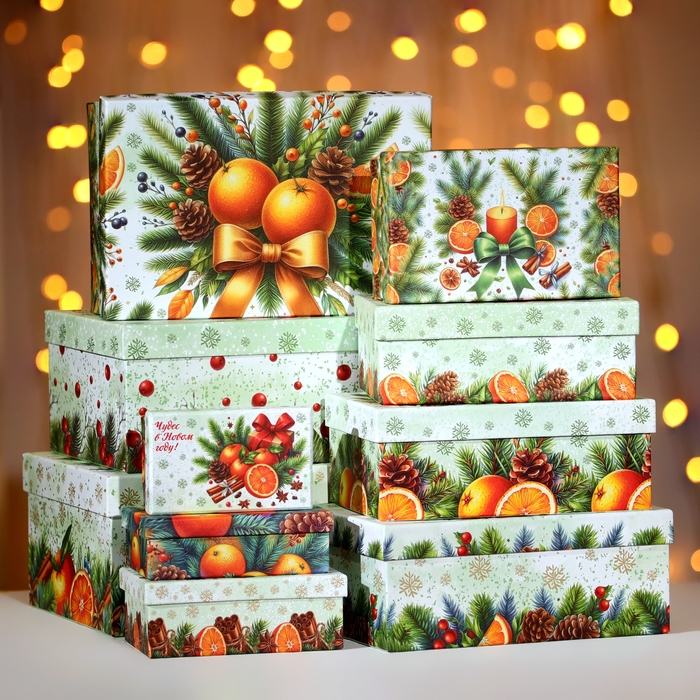 Набор подарочных новогодних коробок 10 в 1 "Мандариновое счастье", 32,5 х 20 х 12,5 - 12 х 7 х 4 см. Новый год