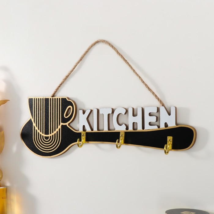 Крючки декоративные дерево "Чашка с ложкой. Кухня" чёрный с золотом 32х10,2 см