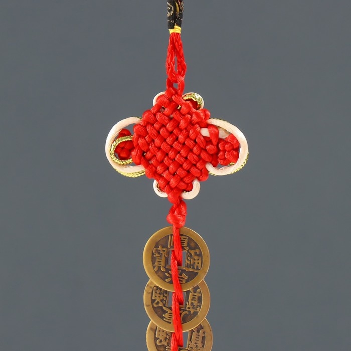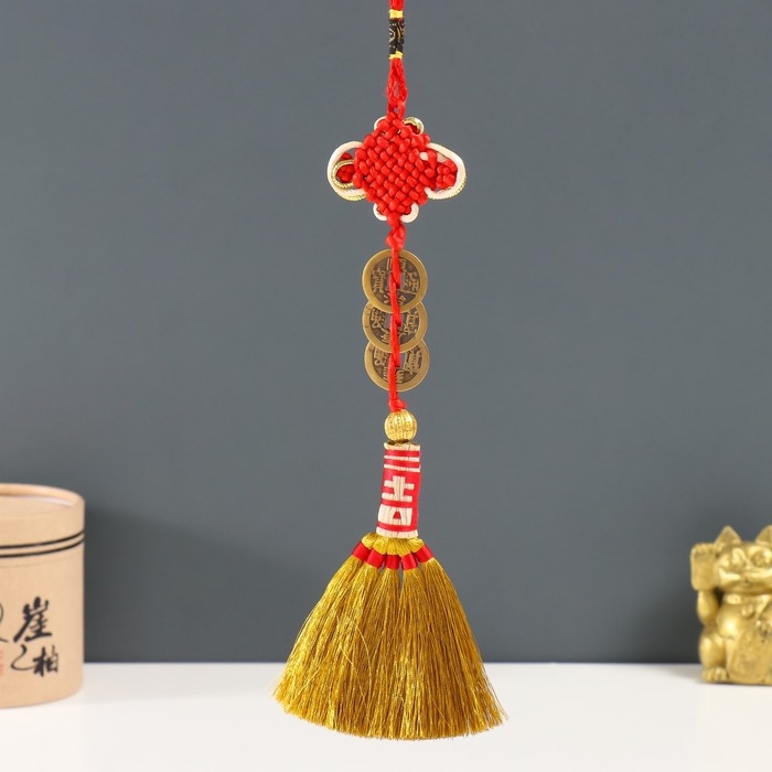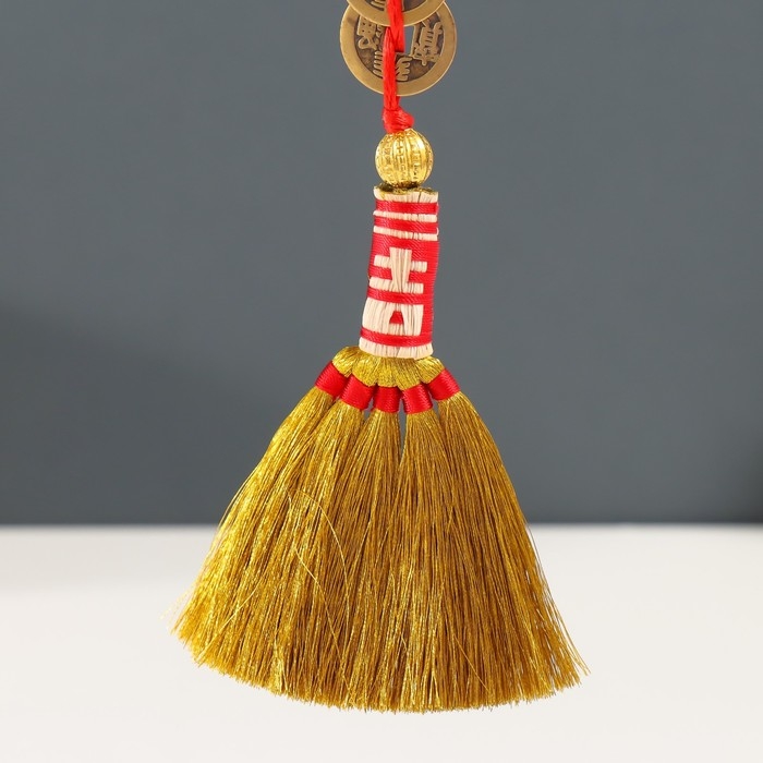 Подвеска текстиль "Золотая метла с 3-мя монетками и узлом Счастья" 30 см