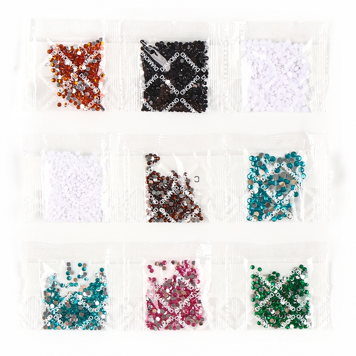 - Из пакетика с номером, который соответствует схеме, отсыпьте в ёмкость немного страз.