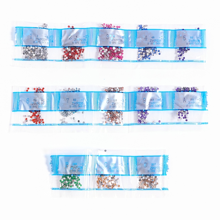 - Из пакетика с номером, который соответствует схеме, отсыпьте в ёмкость немного страз.