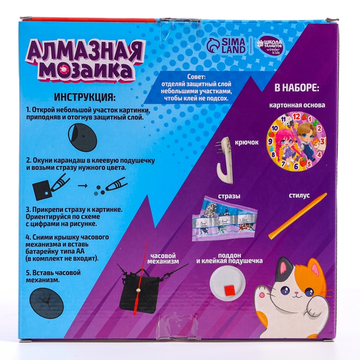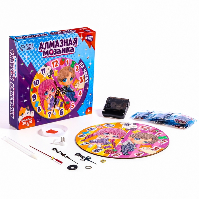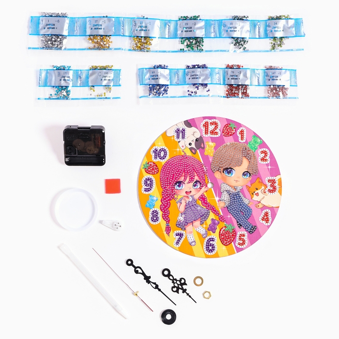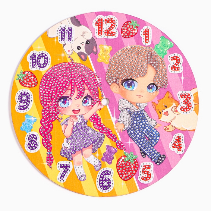 Ребёнку предстоит разложить кристаллики карандашом по пронумерованной схеме, заполнив всё полотно. Часики с клеевым покрытием будут надёжно удерживать стразы.