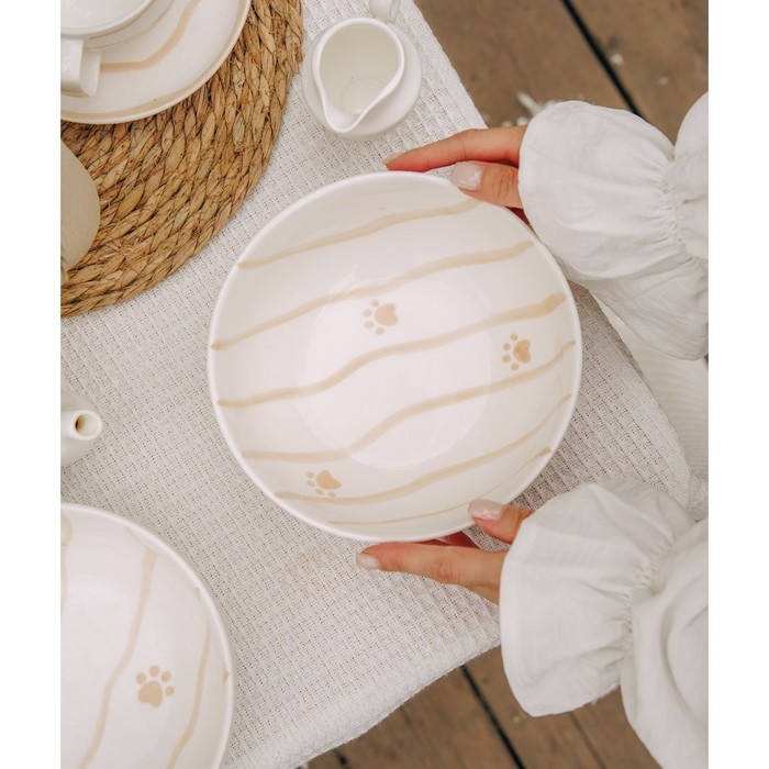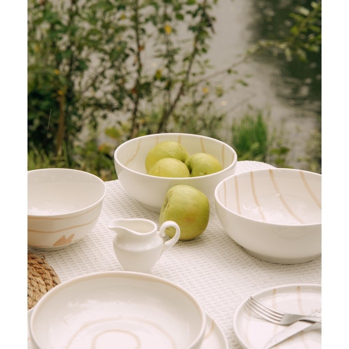Включает в себя два салатника объемом 1,1 литра каждый, диаметр которых составляет 18,5 см. Они выполнены из высококачественного фарфора, который отличается своей долговечностью и эстетичным внешним видом. Бежевый цвет салатников украшен утонченным рисунком в стиле «Животный мир» и полосками, что добавляет изюминку и оригинальность вашему столу.
