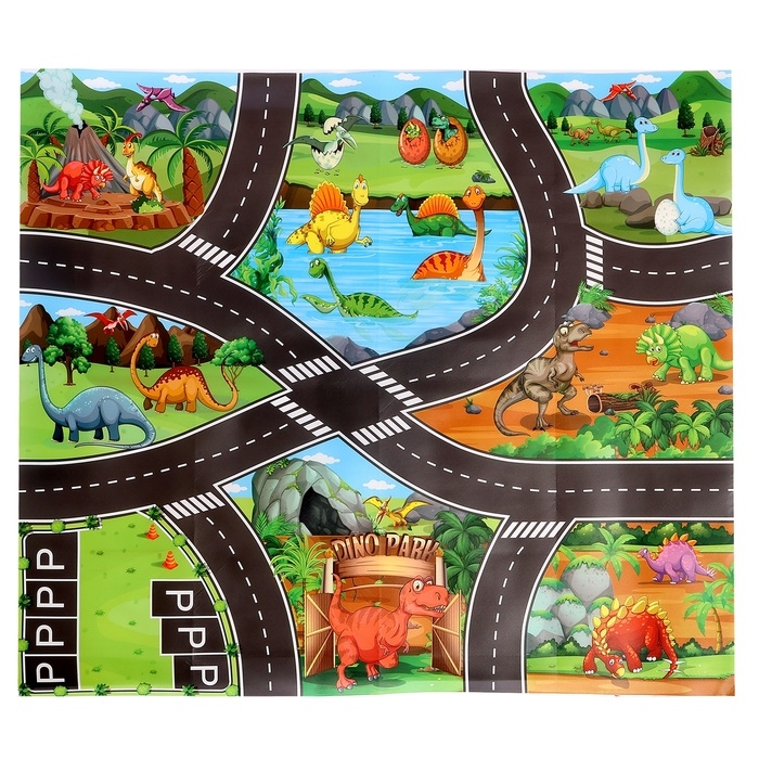 - Коврик размером 70 × 80 см украшен изображениями динозавров, что создаёт реалистичную игровую среду.