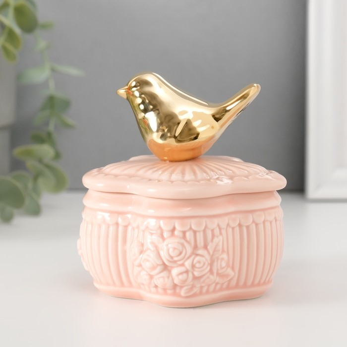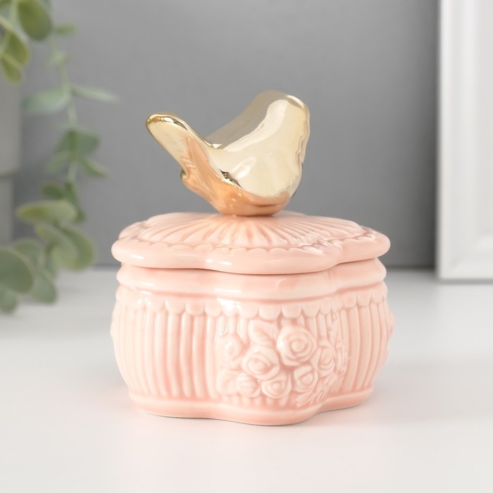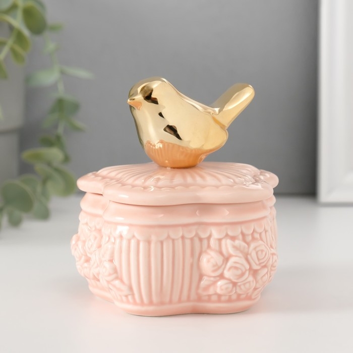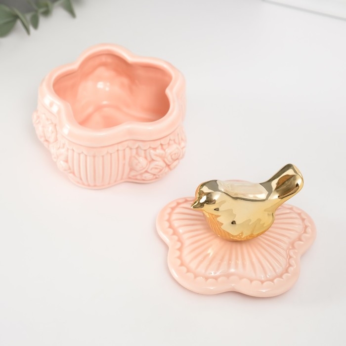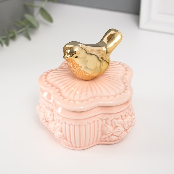 Шкатулка керамика "Птичка на цветке прованс" розовая 8,5х8,5х9,2 см