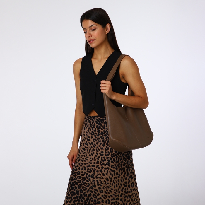 Созданная для современных женщин, которые ценят стиль и функциональность, сумка TEXTURA средней величины в элегантном коричневом цвете станет вашим надежным спутником на каждый день. Эта сумка изготовлена из качественной искусственной кожи, что обеспечивает её долговечность и лёгкость в уходе. Стильный и лаконичный дизайн подчеркивается мягким каркасом и серебристой фурнитурой, придающей изделию изысканность.