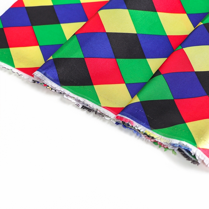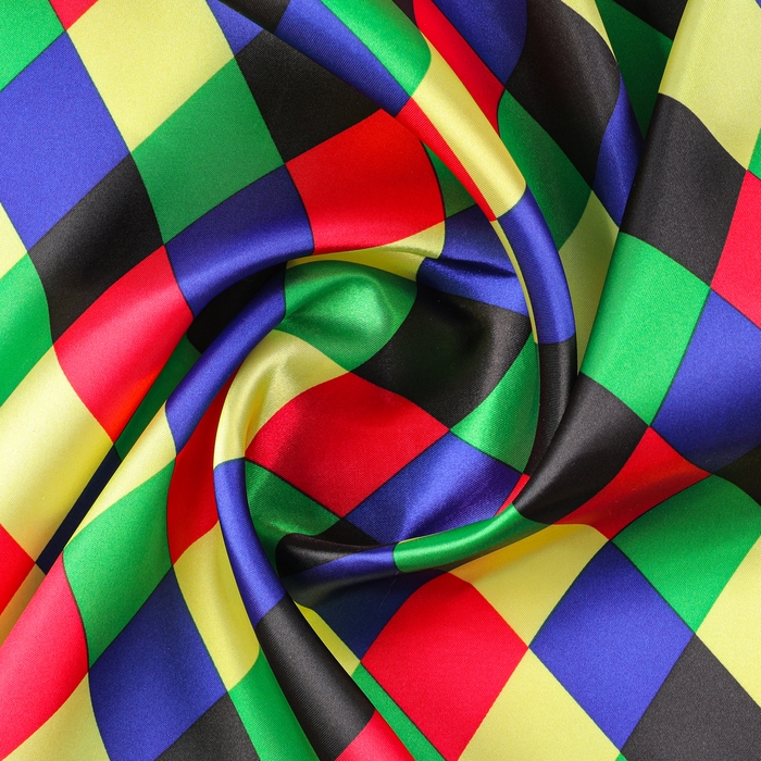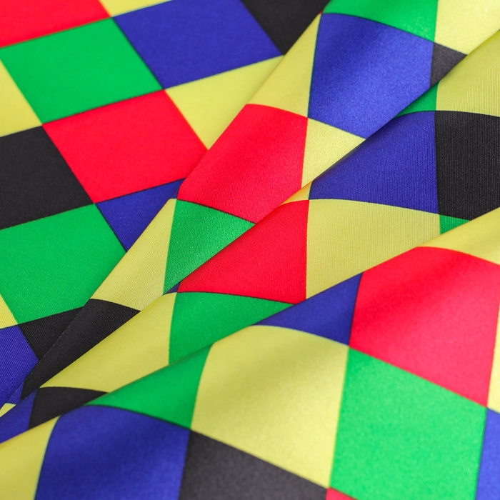 Лоскут для рукоделия из атласа с геометрическим узором в виде цветных ромбов — отличный выбор для создания стильных и оригинальных изделий. Размер полотна 100х150 см позволяет использовать его для шитья текстильных игрушек, аксессуаров или декорирования интерьера. Атласная ткань обладает гладкой и блестящей поверхностью, что придаст готовым изделиям элегантный внешний вид.