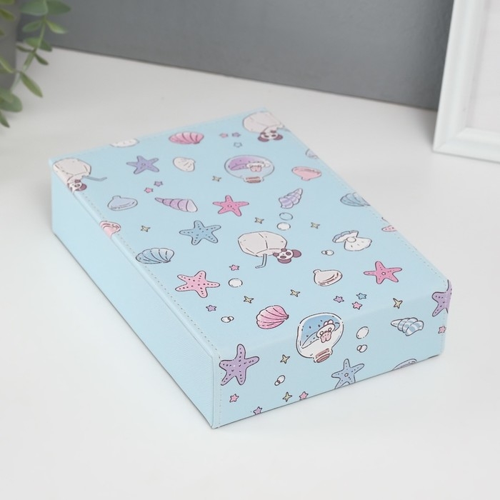 Шкатулка кожзам для украшений с зеркалом "Панда и ракушки" голубая 15х21,5х5,5 см
