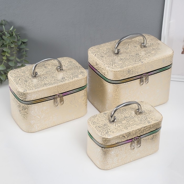 Шкатулка кожзам с зеркалом "Узоры, бабочки" беж н-р 3 шт 19х10,5х10,5 21х13х14 15х23х17см