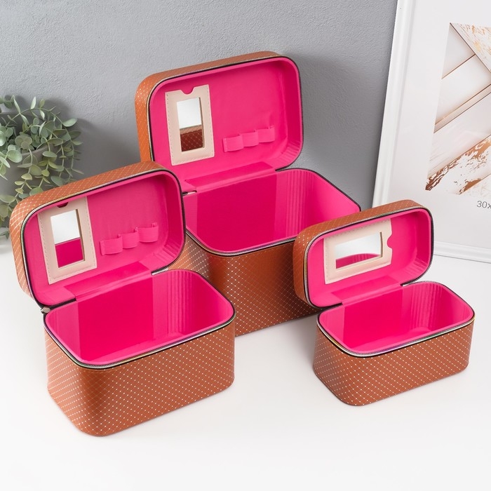 Шкатулка кожзам с зеркалом "Ромбы" охра набор 3 шт 19х10,5х10,5 21х13х14 15х23х17 см