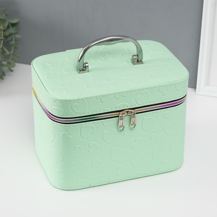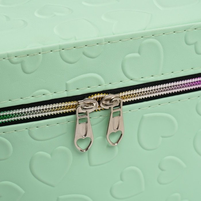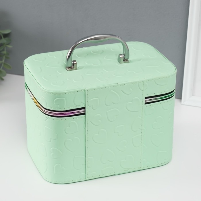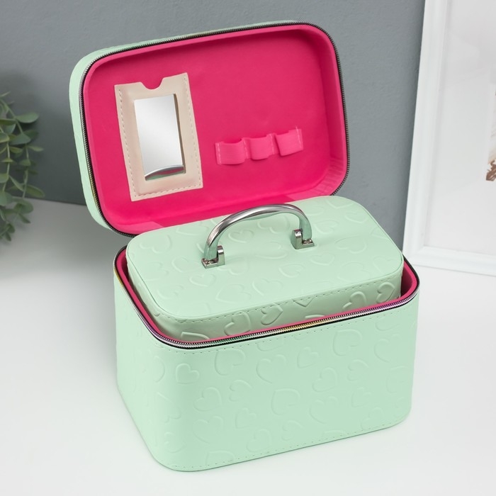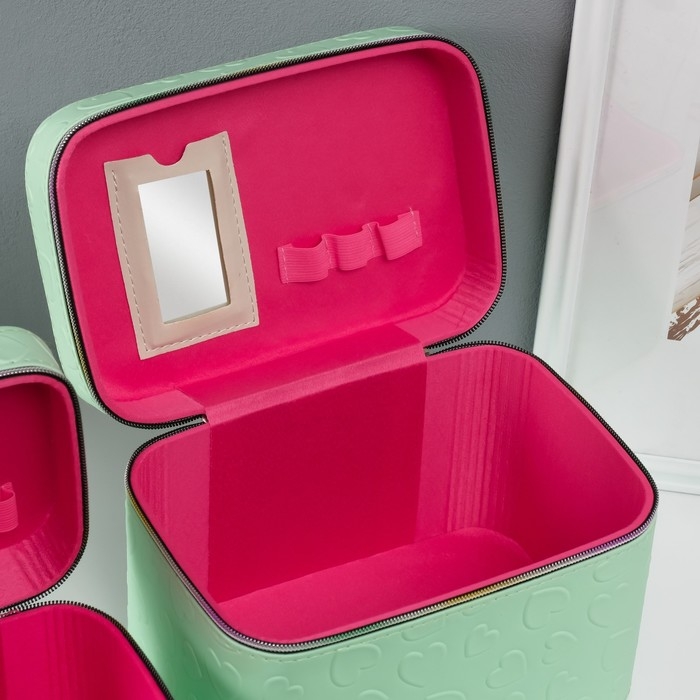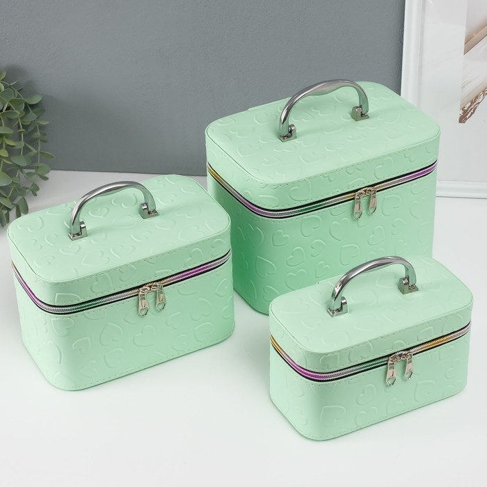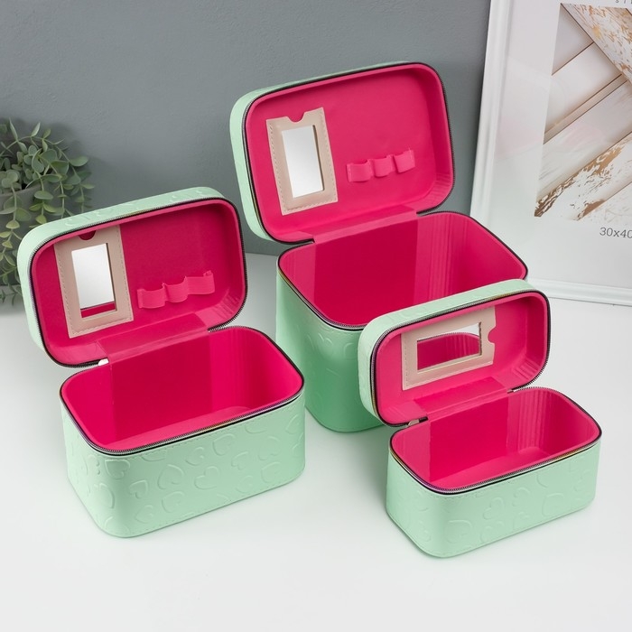 Шкатулка кожзам с зеркалом "Сердца" св-зелёная набор 3 шт 19х10,5х10,5 21х13х14 15х23х17 см