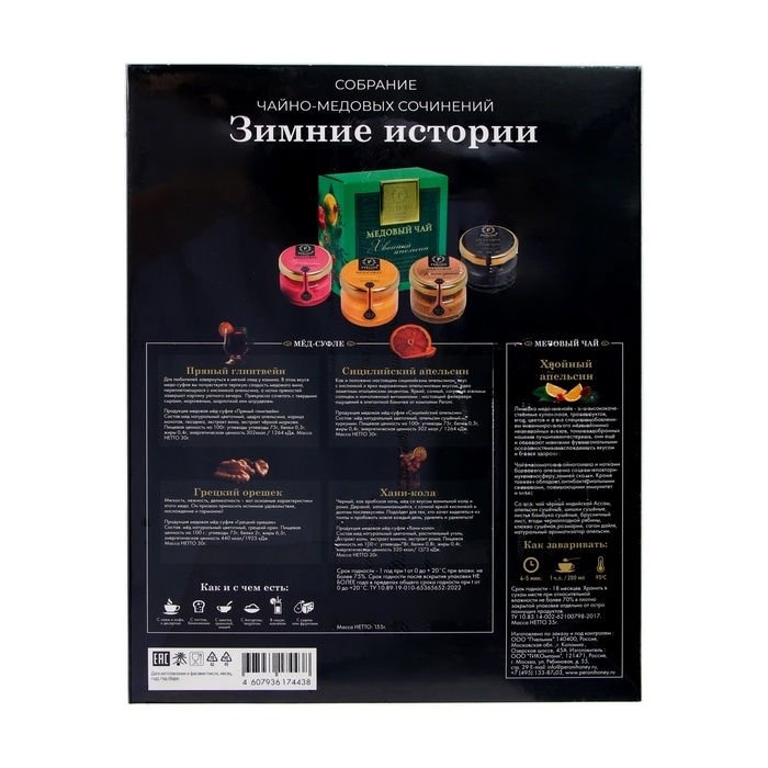 Новогодний набор "Зимние Истории" создан, чтобы добавить волшебства и уюта в ваши зимние дни. В состав набора входят четыре мини-баночки мёда-суфле, каждая из которых обладает уникальным вкусом и текстурой, идеальными для того, чтобы насладиться сладким и мягким медом в любой момент. Эти мини-баночки — отличный способ попробовать разные вкусы меда и выбрать свой любимый. Дополняет набор ароматный медовый чай, который станет отличным сопровождением для меда-суфле, создавая незабываемую комбинацию для вашего удовольствия.