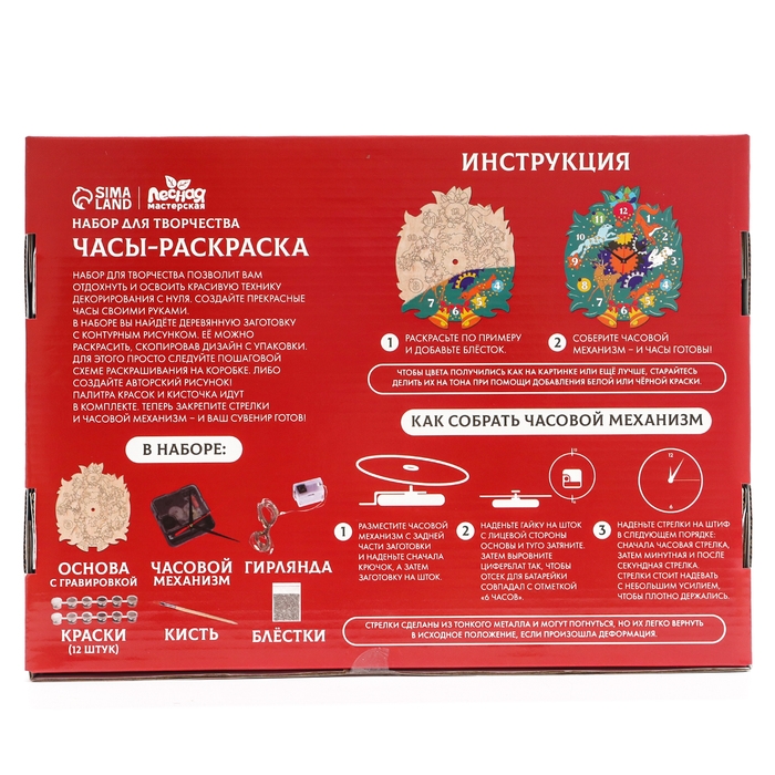 - Вы можете раскрасить детали часов по предложенной схеме на коробке или придумать свои уникальные цветовые сочетания.