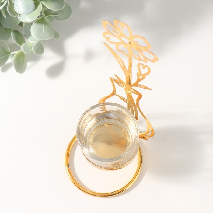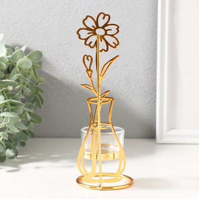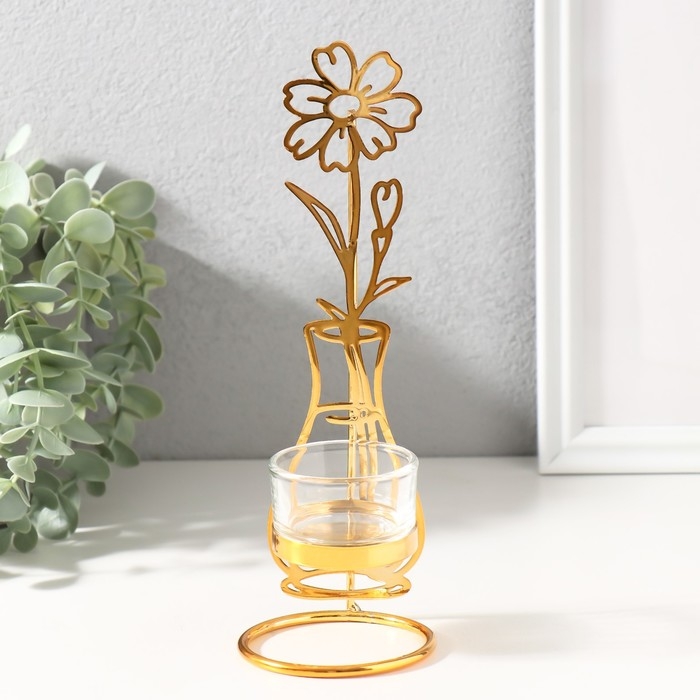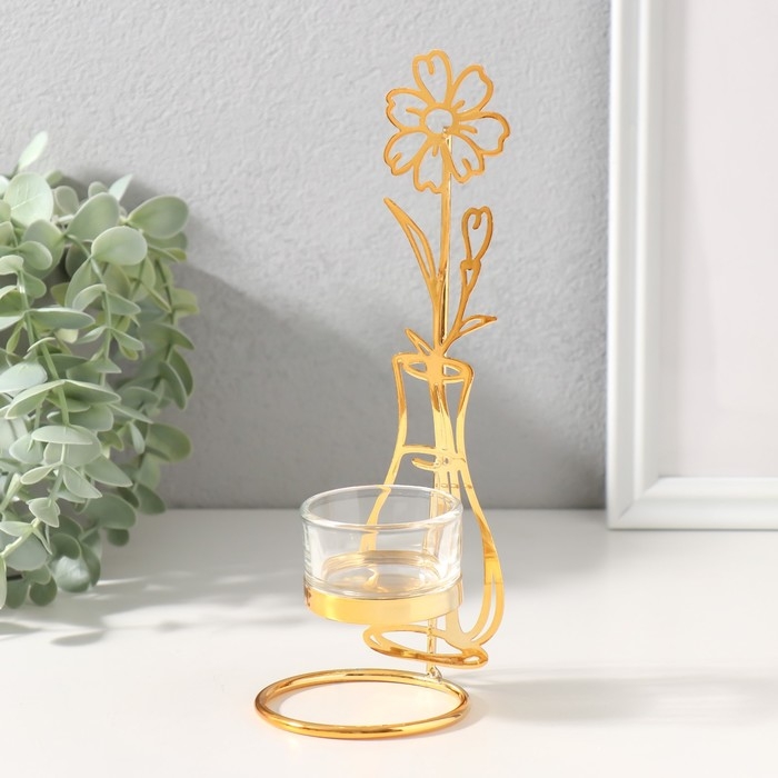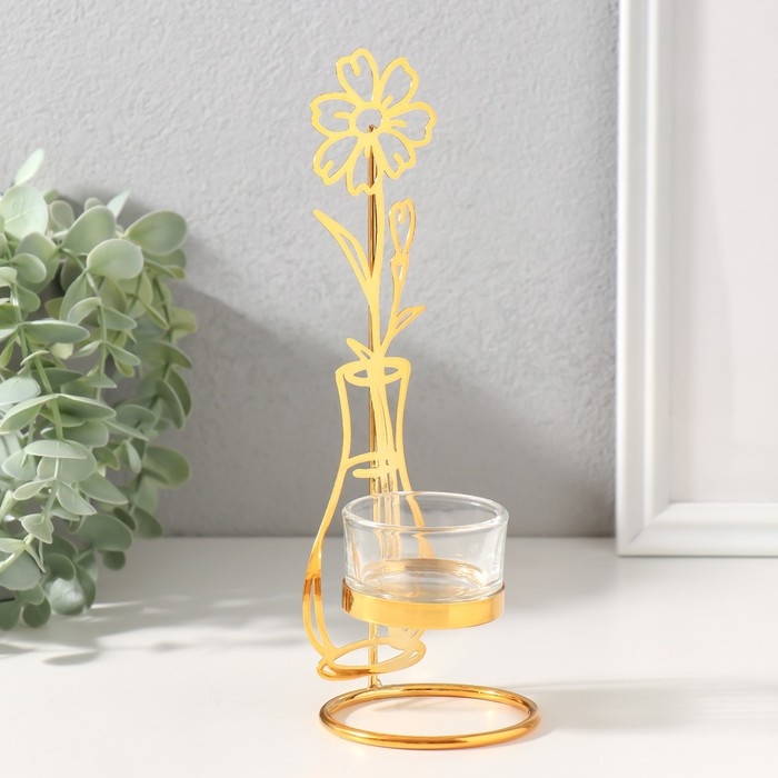 Подсвечник на 1 свечу металл, стекло d=4,5 см "Цветок в вазе" золото 7,4х7,5х21 см