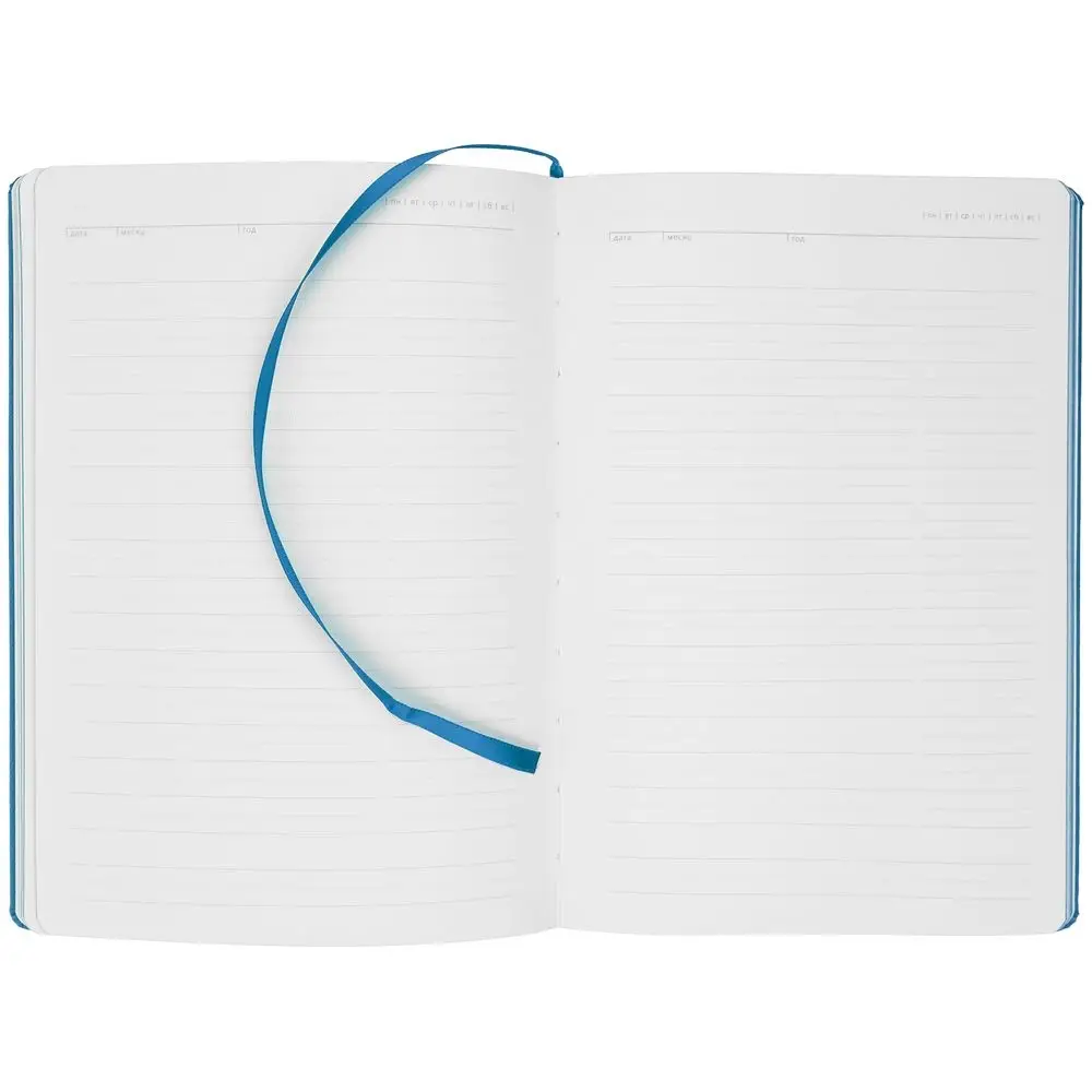 Ежедневник с твердой обложкой и тонированным обрезом. Выполнен из материала Latte, ярко-синий, дополнен ляссе в цвет обложки.