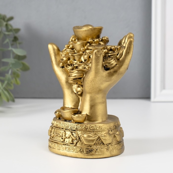 Нэцкэ полистоун под бронзу "Монеты и слитки в ладонях" 7,7х10,7х14 см