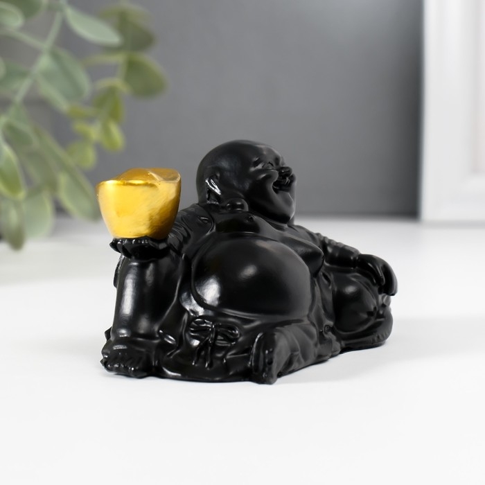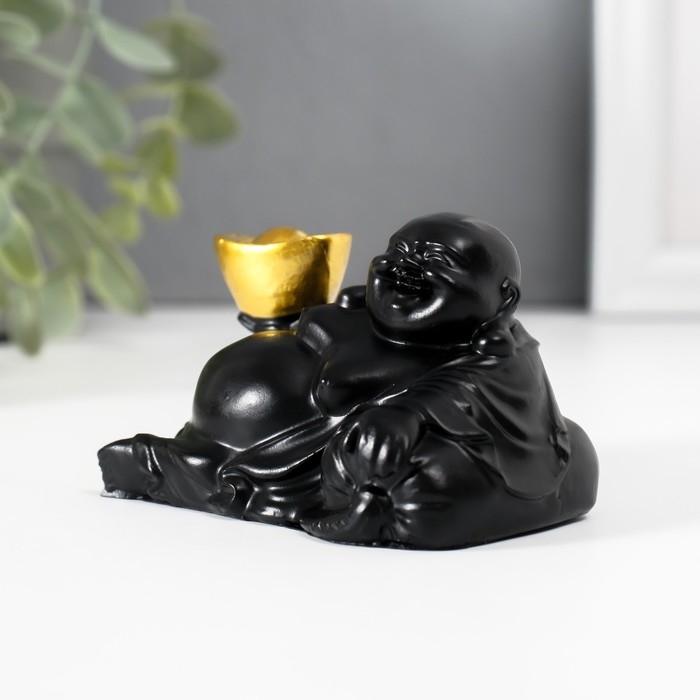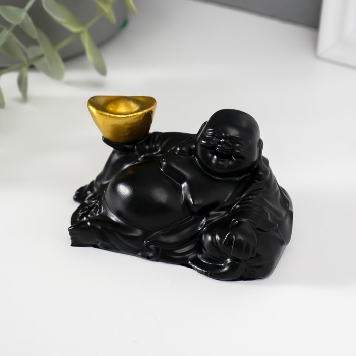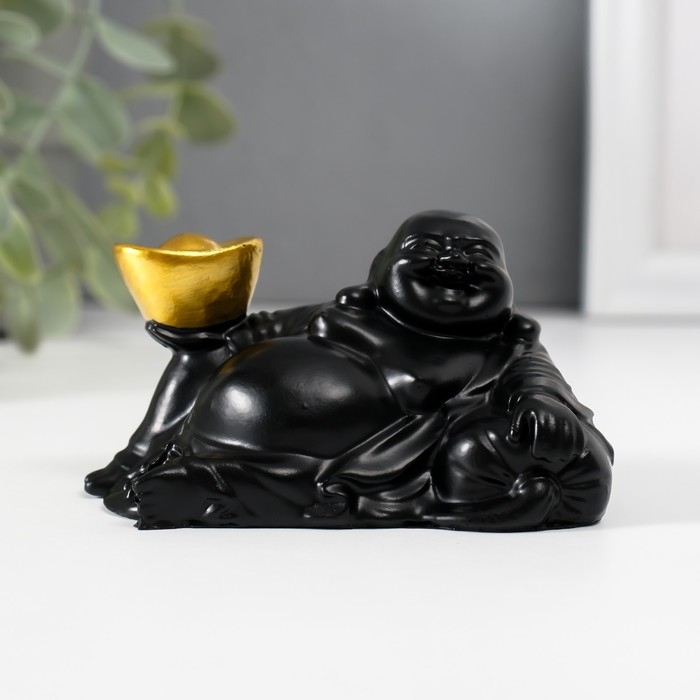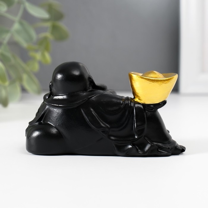 Нэцкэ полистоун "Хотей с золотым слитком, лежит на мешке" чёрный 5х8,5х5 см