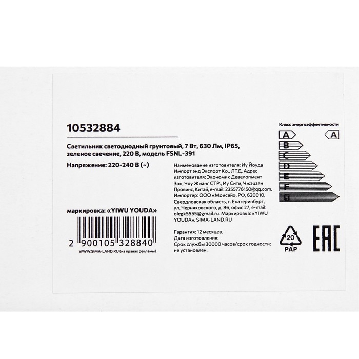 Светильник светодиодный грунтовый, 7 Вт, 630 Лм, IP65, зеленое свечение, 220 В