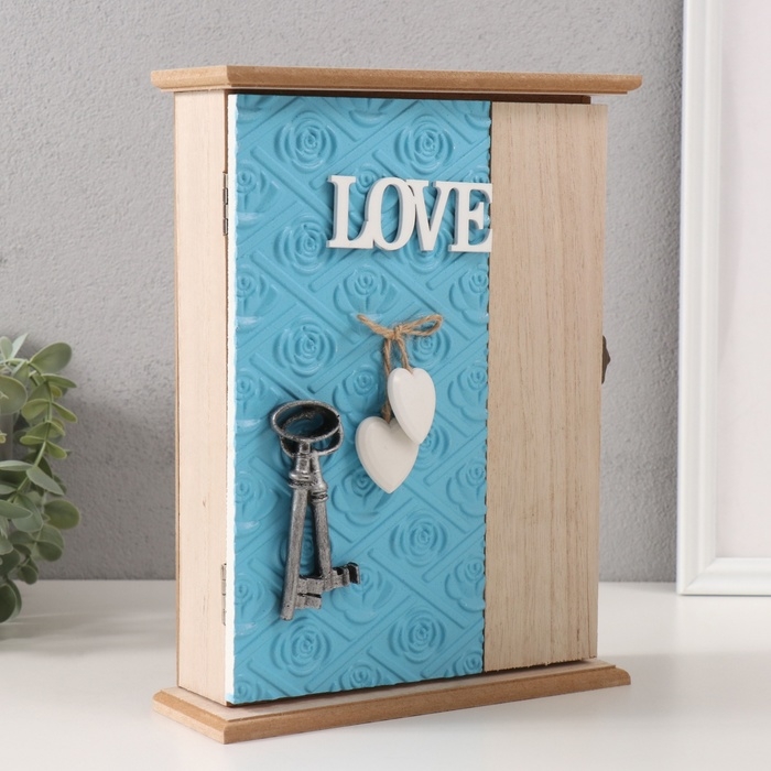 Ключница дерево 6 крючков "Роза. Ключи и сердце" голубой 6,5х20х26,5 см