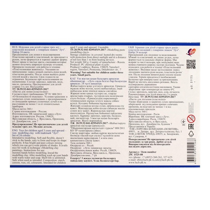 Пластилин мягкий (восковой) Calligrata, 24 цвета, 360 г