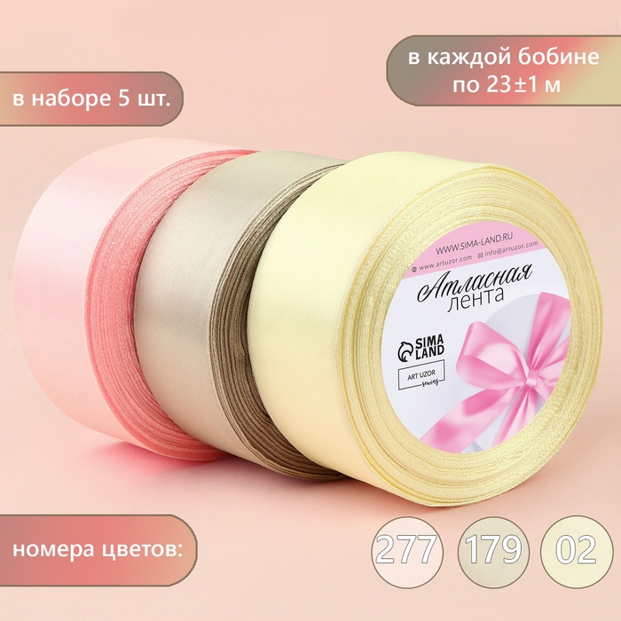 Набор атласных лент, 5 шт, размер лент: 6/10/20/40/50 мм × 23 ± 1 м, цвет сливочный