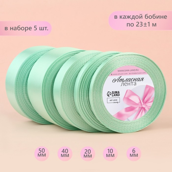 Набор атласных лент, 5 шт, размер лент: 6/10/20/40/50 мм × 23 ± 1 м, цвет нежно-бирюзовый
