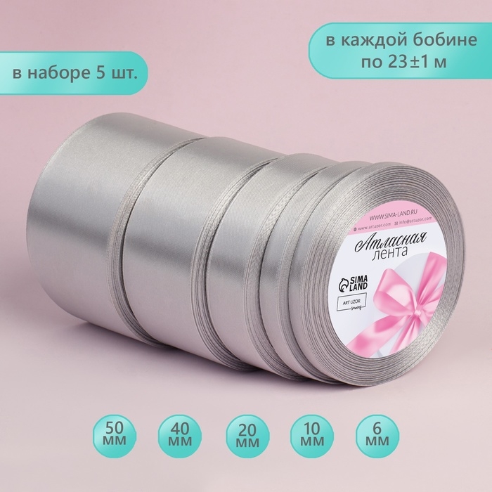 Набор атласных лент, 5 шт, размер лент: 6/10/20/40/50 мм × 23 ± 1 м, цвет светло-серый
