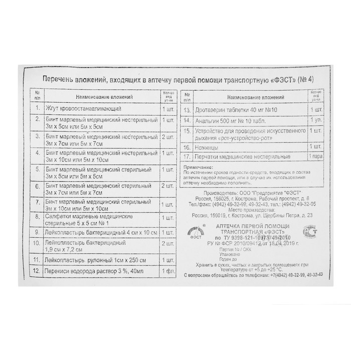 Аптечка первой помощи транспортная "ФЭСТ", перечень №4