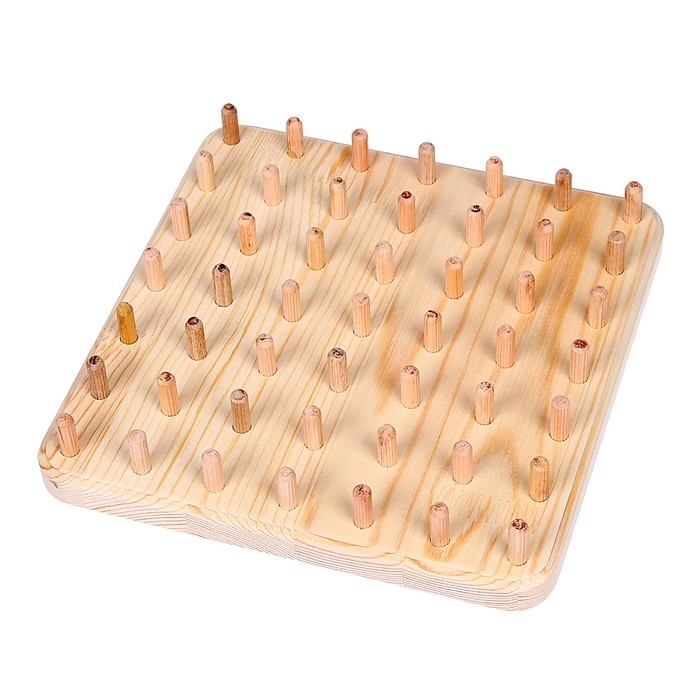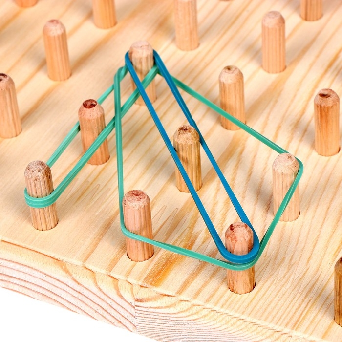 Геоборд — это специальная доска для конструирования различных изображений с помощью равноудалённых друг от друга штырьков и резиночек. Их малышу предстоит нанизывать на выпуклые элементы и создавать таким образом разнообразные фигуры.