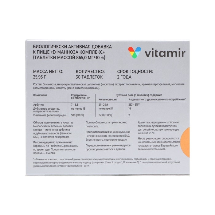 Комплекс D-манноза ВИТАМИР - это простой природный сахар, который организм использует для очищения мочевыводящих путей и поддержания здоровья слизистой оболочки мочевого пузыря. Он переваривается только в небольших количествах, а избыток быстро выводится с мочой, поэтому он не мешает нормальному регулированию уровня сахара в крови. Клинические исследования показали, что при регулярном приеме D-манноза способствует нормальной работе мочевыводящих путей, очищая и поддерживая здоровье слизистой оболочки мочевого пузыря.