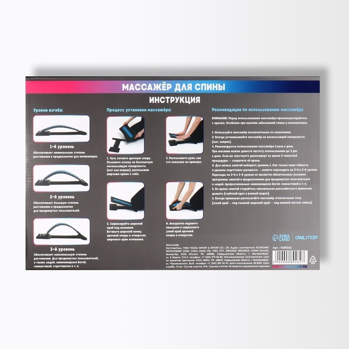 Изделие рекомендуется устанавливать на твёрдой поверхности. Четырёхуровневая конструкция позволяет использовать массажёр как новичкам, так и профессионалам. Начинать всегда следует с первого уровня, поднимая высоту мостика по мере привыкания. Это позволит избежать дискомфорта, расслабиться и получать удовольствие во время процедуры. Используйте массажёр по 5–10 минут 1–2 раза в день. После немного полежите на кровати или лягте спать.