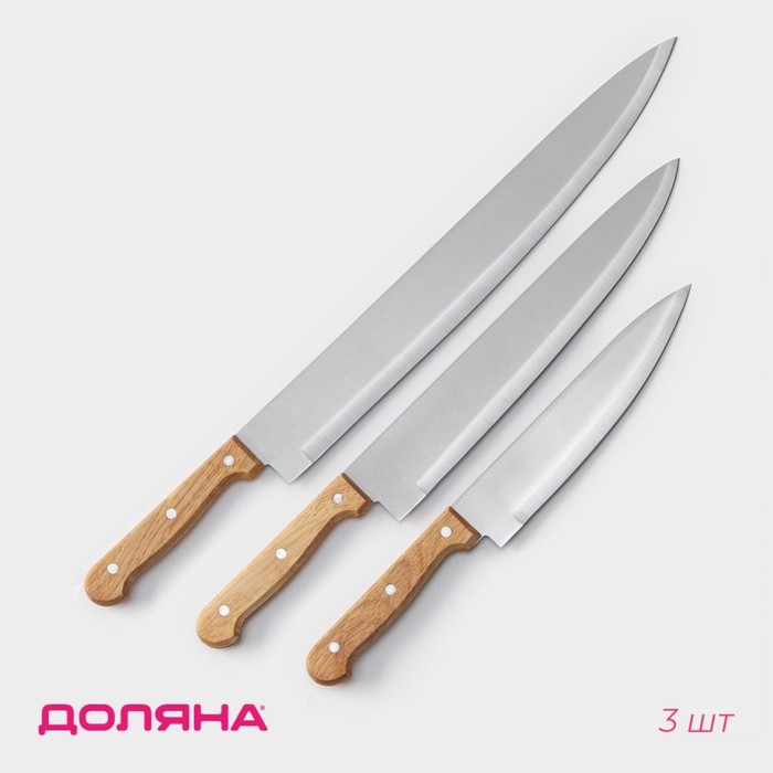 Набор кухонных ножей Доляна «Поварская тройка», 3 предмета: лезвие 18 см, 25,5 см, 33 см, ручка деревянная