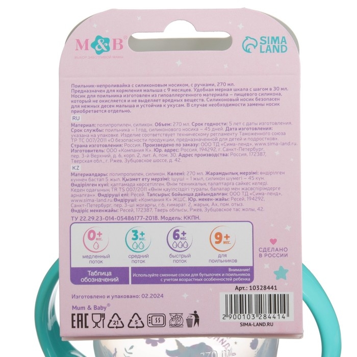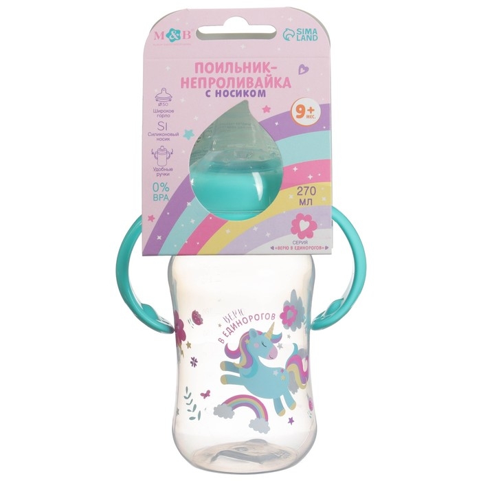 Поильник-непроливайка, мягкий носик, от 9 мес., 270 мл., «Единорог», M&B