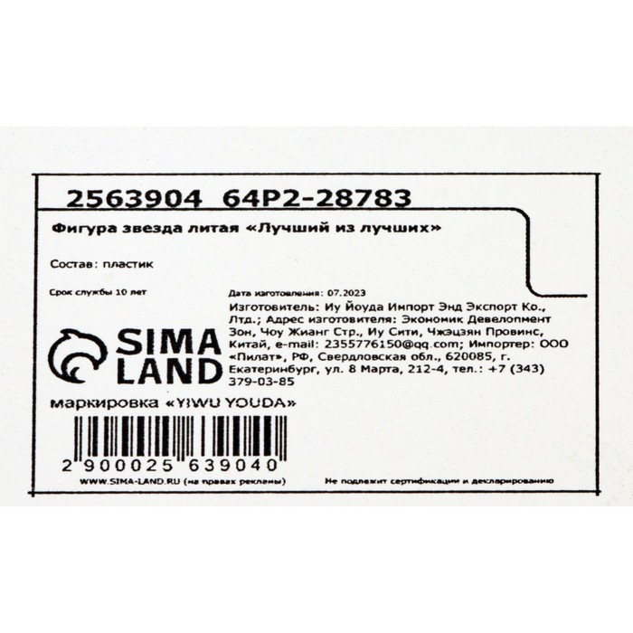 Кубок наградная фигура: звезда литая «Лучший из лучших» золото, пластик, 16 х 8,5 х 6 см.