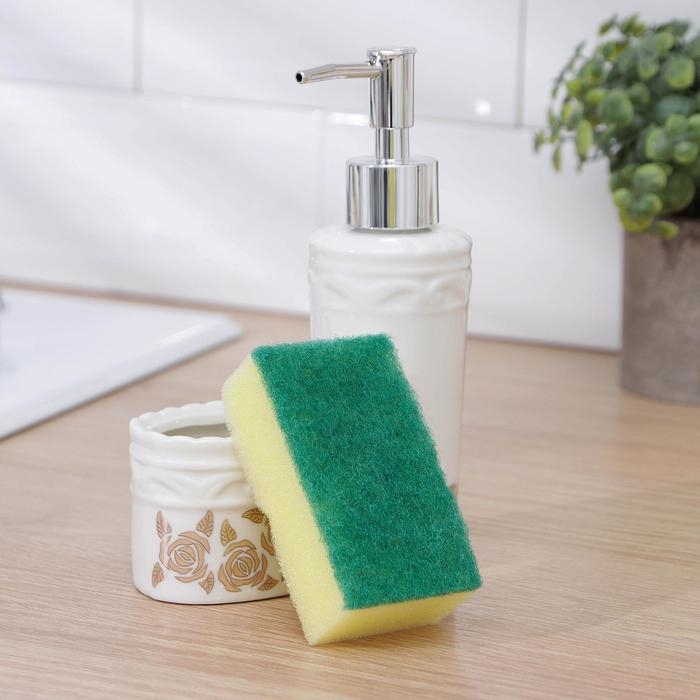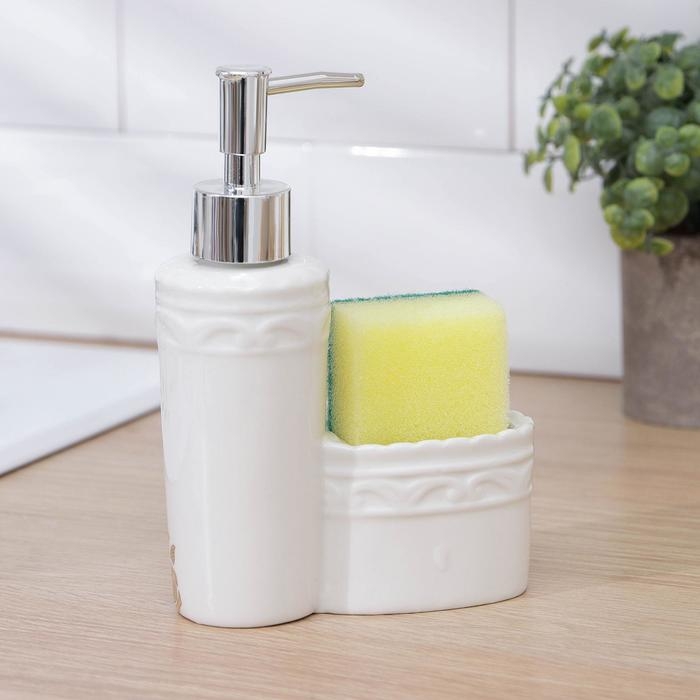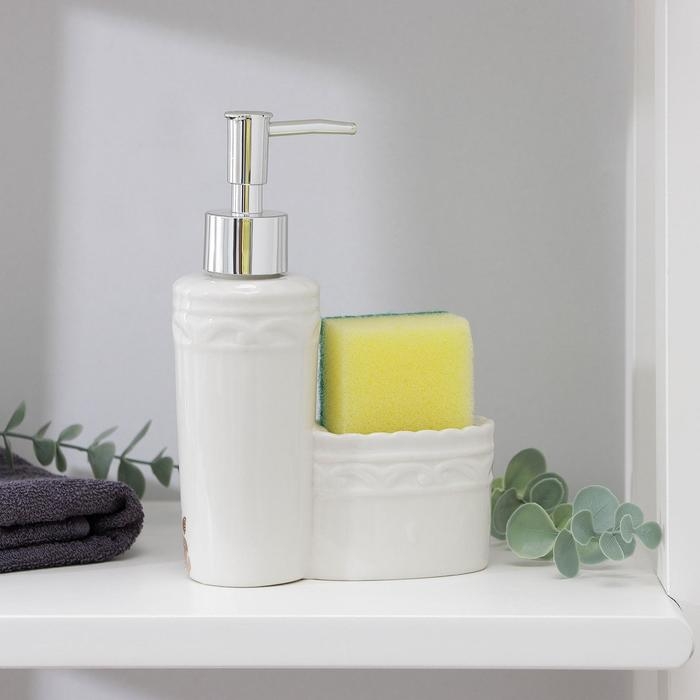 Дозатор для моющего средства с подставкой для губки Доляна, губка в комплекте, 385 мл, цвет белый