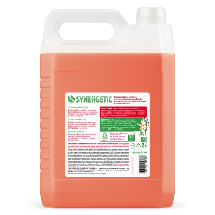 Средство для мытья посуды Synergetic "Арбуз", с антибактериальным эффектом, 5 л