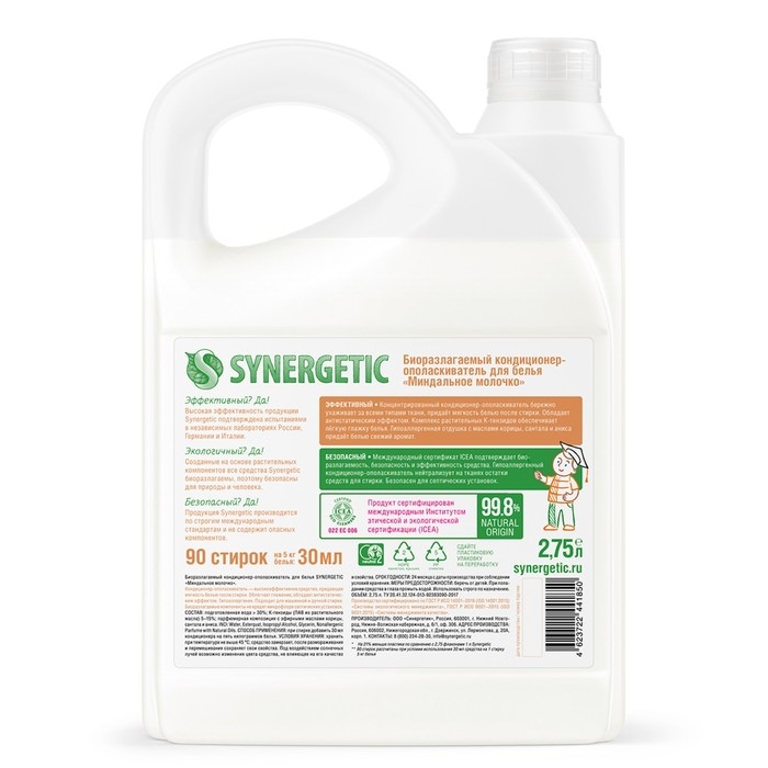 Биоразлагаемый кондиционер-ополаскиватель для белья SYNERGETIC "Миндальное молочко" – высокоэффективное средство, бережно ухаживающее за всеми типами ткани, в том числе деликатными, и придающее особую мягкость и нежность белью после стирки.