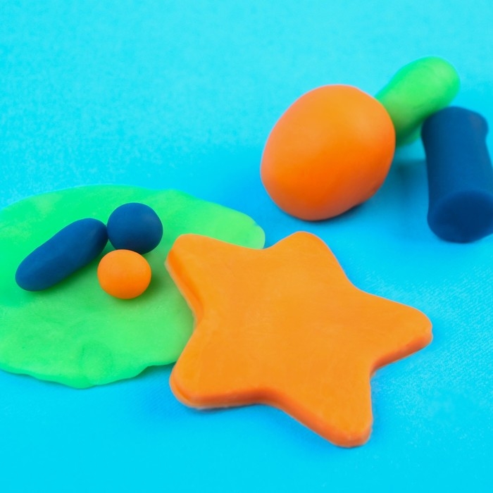 3 баночки с пластилином оранжевого, зеленого и синего цвета;