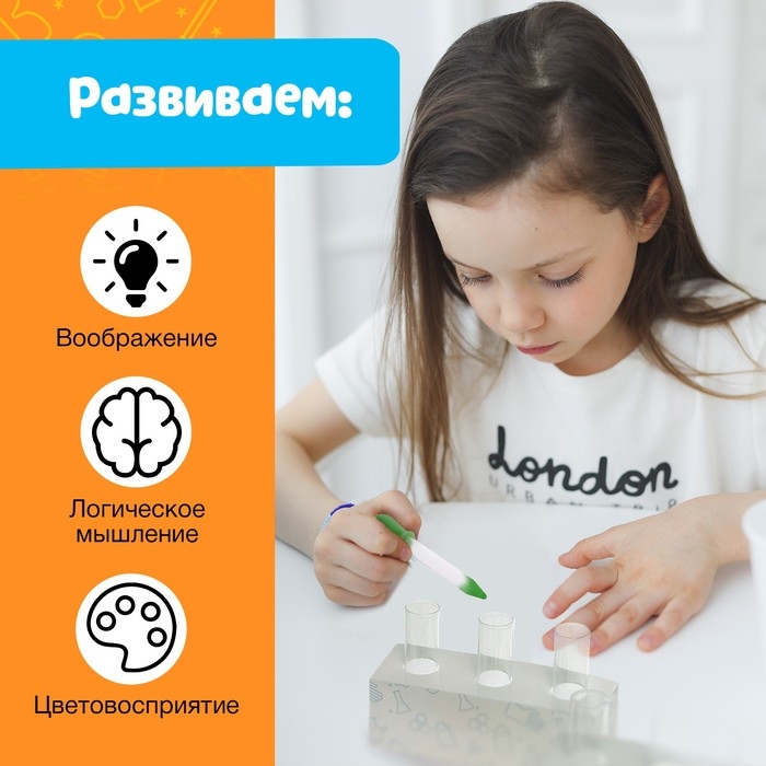 Внутри вы найдёте 4 цветные пипетки, 4 баночки с краской, 6 колб и карточки с 20 заданиями.