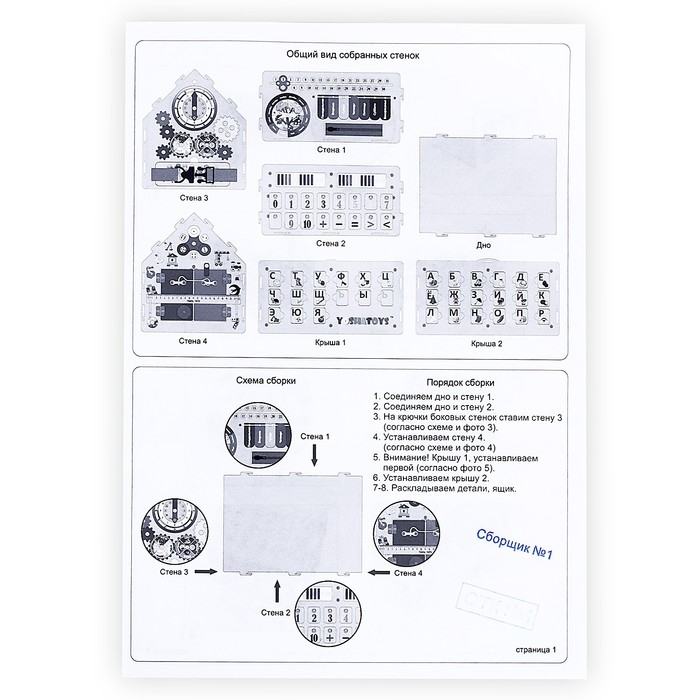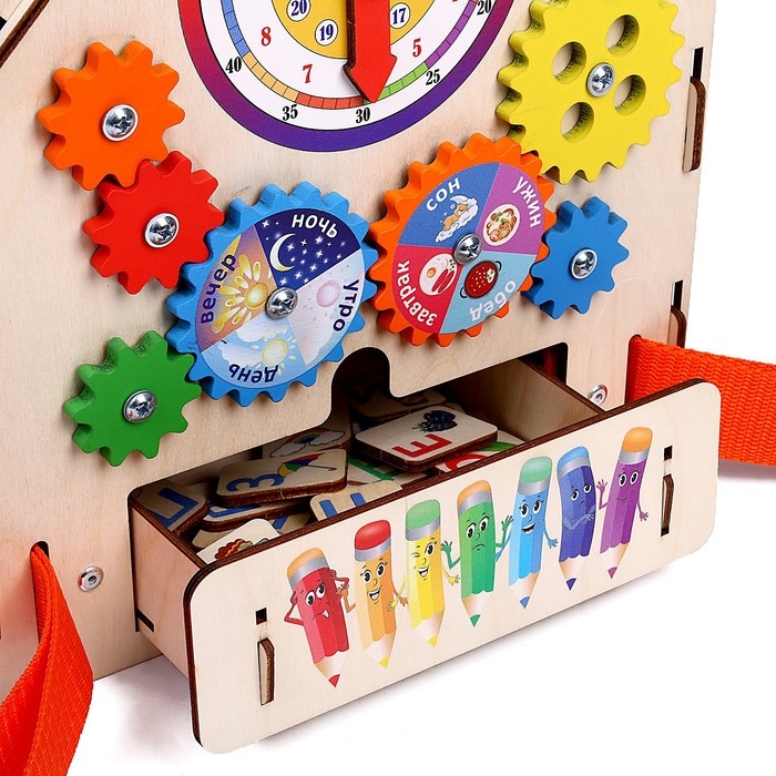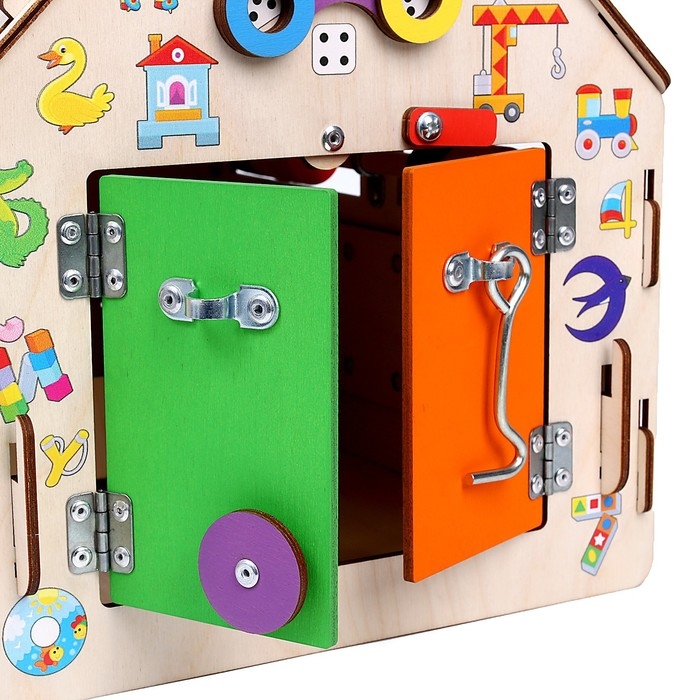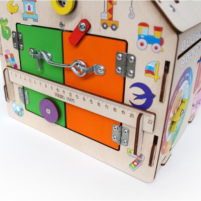 - Развивает мелкую моторику: различные замочки, шестеренки, дверцы и другие элементы тренируют ловкость и координацию маленьких пальчиков.